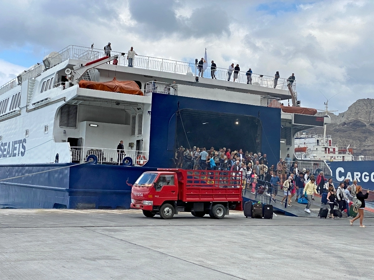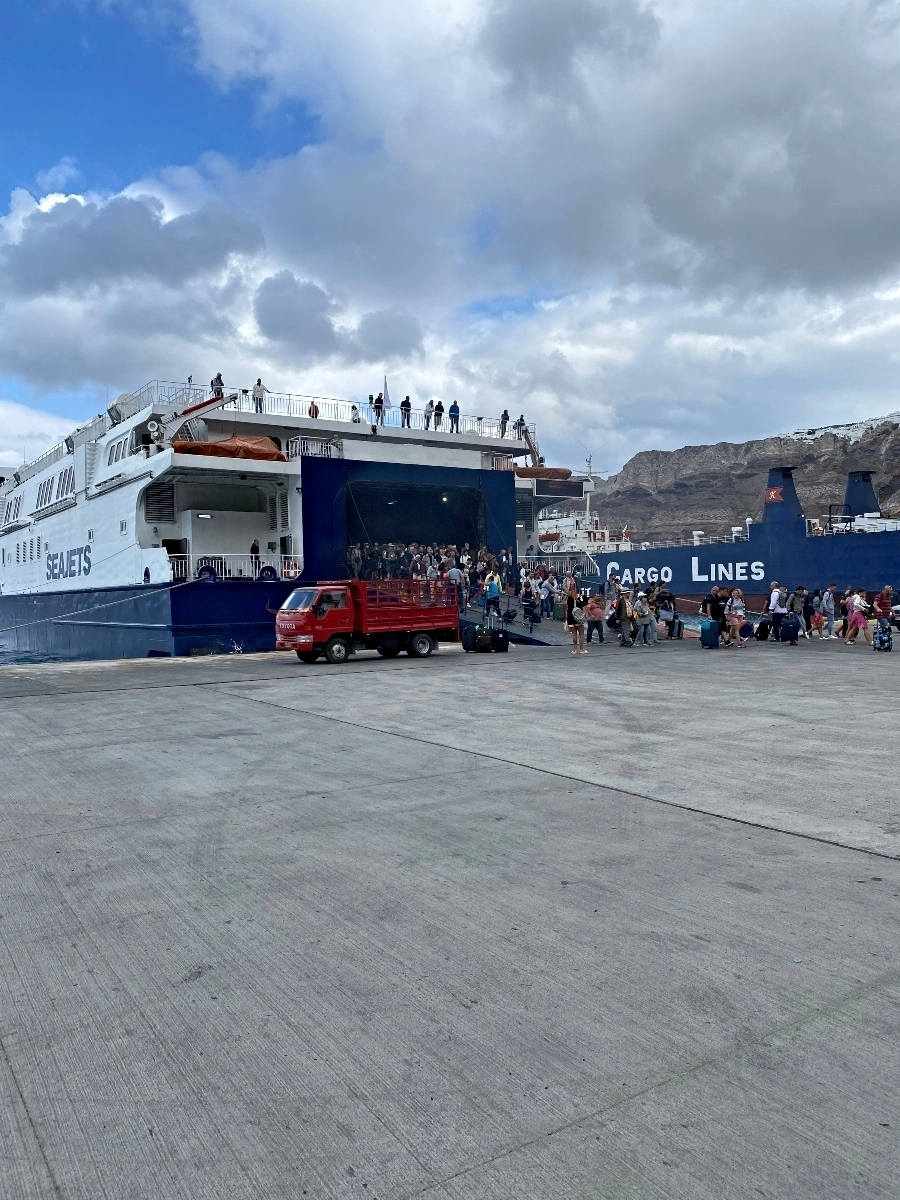 Today began with a taxi ride down to the Ferry port, where we would hop on a ferry to Mykonos. It was a 2 1/2 hour ride, and a bit bumpy but it was definitely an experience. We got on with about 700 people, all at the same time. With all our suitcases and personal belongings in tow. Once on board we did have assigned seat and it was very comfortable.