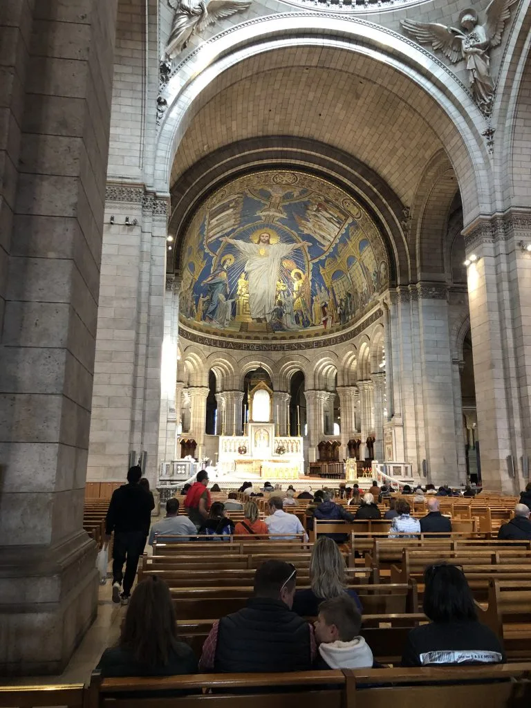 Saw the Moulin. Rouge and then began walking up hill to the famous church Sacre de Cour. We finally made it and what a sight. It sits high above the city and the view of Paris was amazing. Inside and out it was gorgeous.