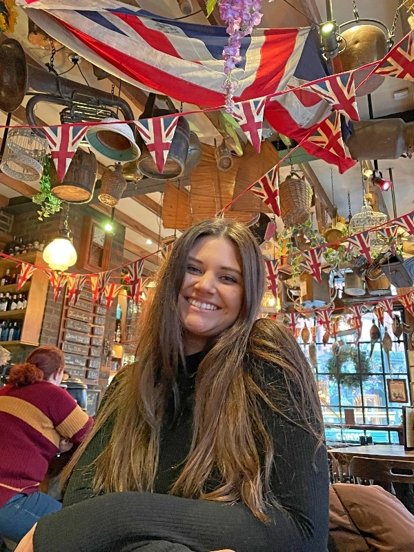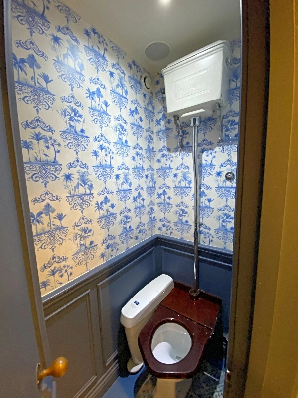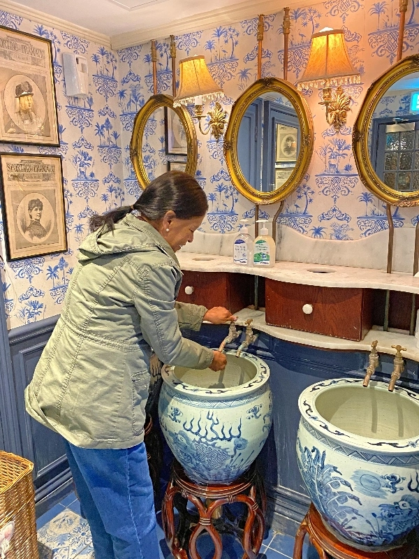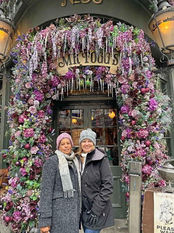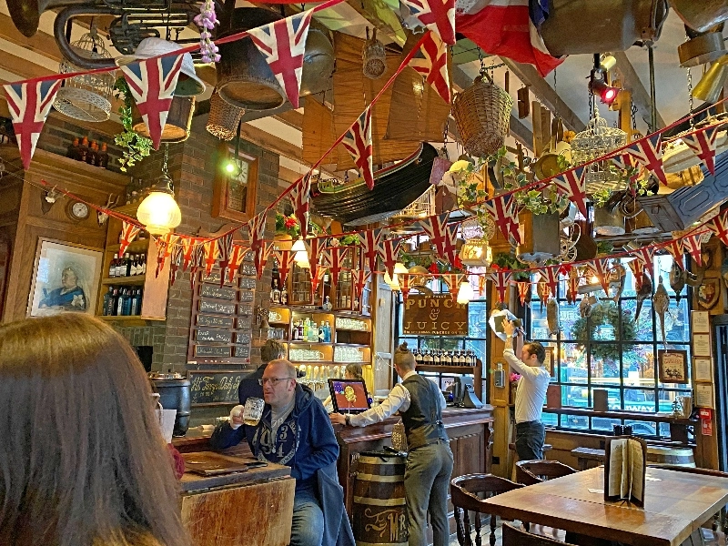 Lauren was our food & pub finder, and she did a fantastic job finding places. Our lunch spot was Mr. Toad’s Pub which was decorated for the holidays and had special holiday menu featuring mulled wine, our new favorite drink. Elsie was fascinated with the old-fashioned restrooms.